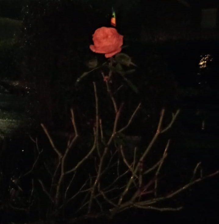 Как-то поздно вечером я выглянула в окно – роза буквально горела, освещенная светом фонаря. Она была прекрасна - настоящее предрождественское Чудо! Но что-то внутри подсказало мне спуститься и сфотографировать ее именно сейчас. И это было правильно – ведь была ее последняя ночь...
