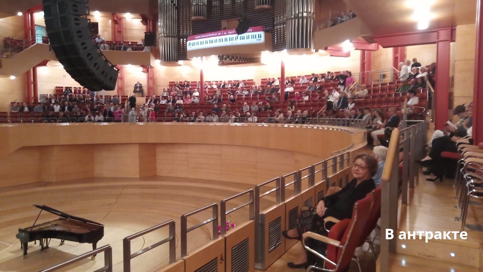 Через пару часов мы приехали на концерт. И - о Боже. Огромная очередь на парковку. Причем с двух сторон. Успеть бы! Номера на машинах - со всех городов Германии... Слава Богу, успели запарковаться и скорее в зал, искать свои места. Зал - роскошный, огромный, но все же очень уютный, с красными бархатными креслами, великолепным органом и удивительной необычной деревянной люстрой, висящей прямо над сценой. Зал постепенно заполнялся зрителями по обе стороны сцены.
